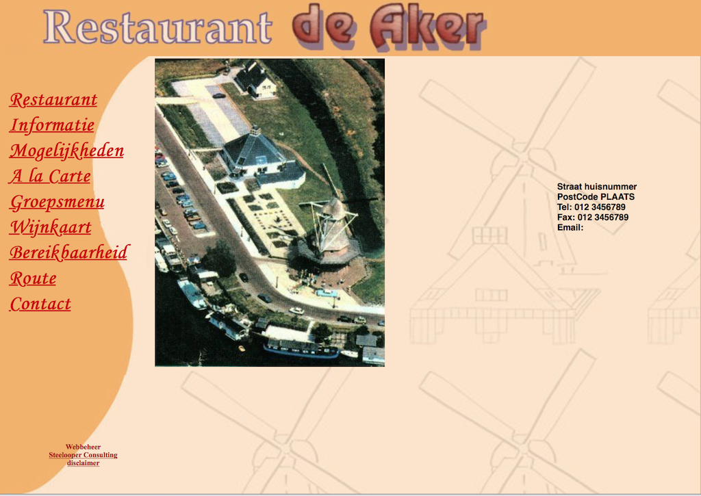 Restaurant de Aker (verkocht en nu opererend onder de naam Syriana) Voor restaurant de Aker hebben we een dynamische backend gemaakt waarin de eigenaar zelf de menukaart kon onderhouden door enkel het invoeren van platte tekst. |