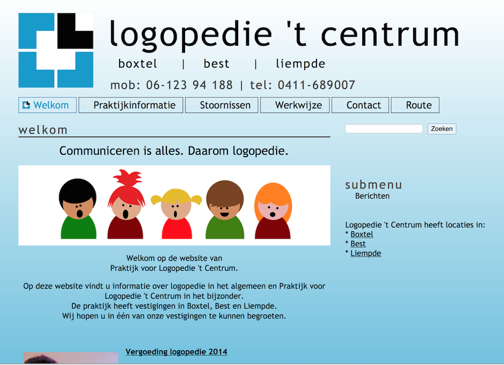 Voor Logopedie 't Centrum hebben we een custom thema ontwikkeld. Dit thema moest de doelgroep (Kinderen) aanspreken en is derhalve speels opgezet. Deze website kan door de eigenaresse volledig zelf onderhouden worden. |