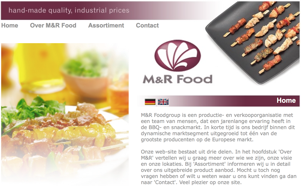 M&R Food Manufacturing (failliet gegaan in 2009) M&R Food Manufacturing had een website laten maken door een reclame bureau, echter via deze partij moesten ook alle wijzigingen doorgevoerd worden. Dit bracht hoge kosten met zich mee. Voor hun hebben we de hele website omgebouwd naar een systeem dat ze zelf konden onderhouden. Ook hebben we de hele website meertalig gemaakt. Op elke pagina kan door een simpele klik de taal aangepast worden naar Nederlands, Duits of Engels. |